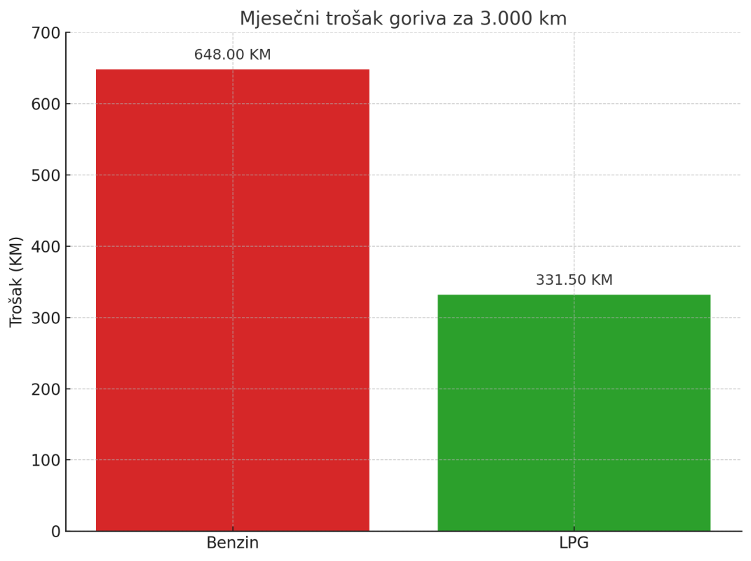 Ugradnja kvalitetnog LPG sistema košta oko 1.000–1.100 KM i otplaćuje se već nakon 3 do 4 mjeseca redovne vožnje. Nakon toga – čista dobit!